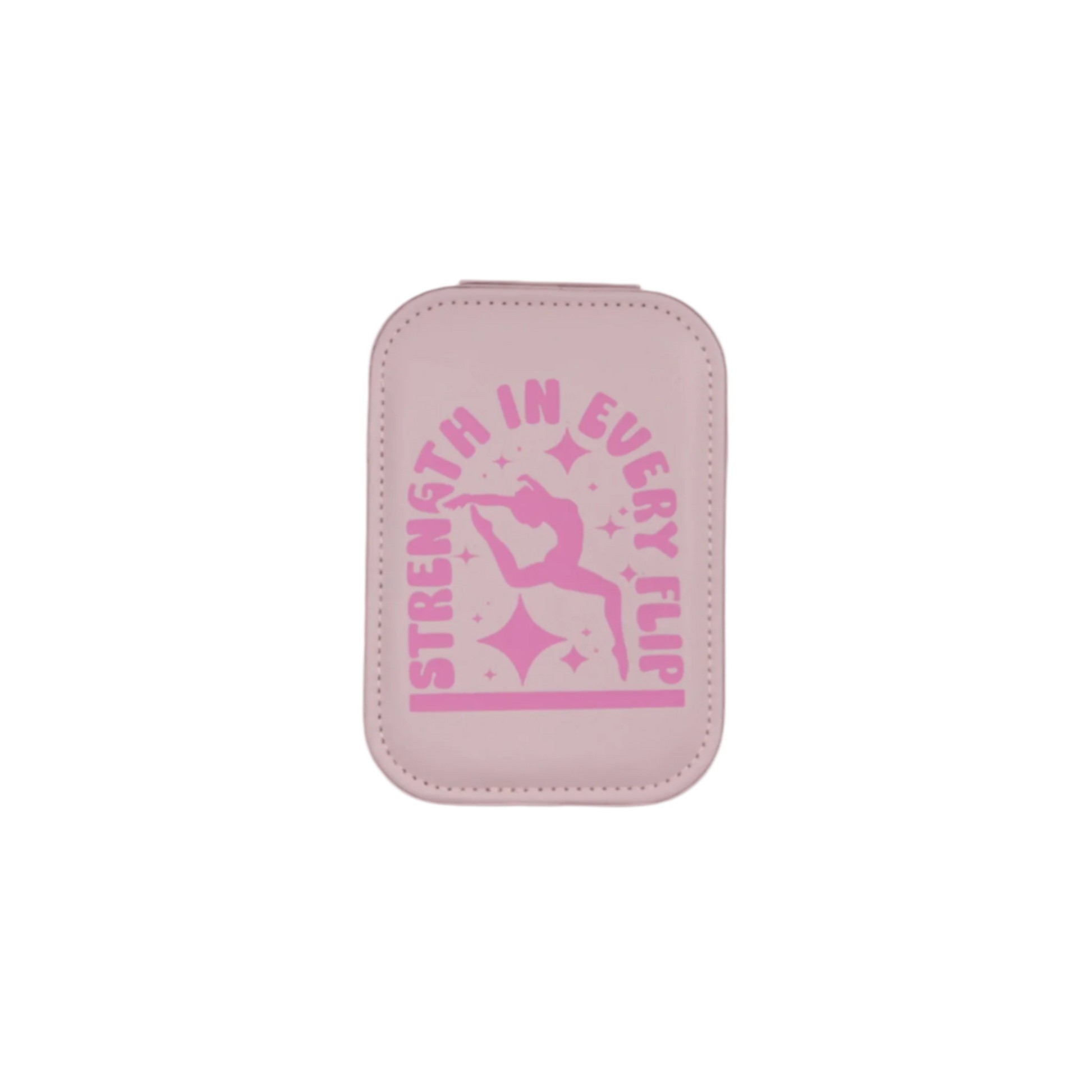 Get competition-ready anywhere with this handy accessory case featuring a lighted mirror!  This zippered case includes multiple compartments to store everything from scrunchies to bobby pins to lip gloss and more.  Plus, it offers both cool and warm tone lighting for the perfect touch-up, no matter where you are.